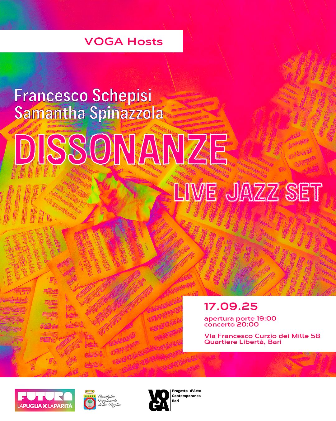 17 settembre 2025 | start h 19:00 VOGA HOSTS VOGA HOSTS VOGA HOSTS VOGA HOSTS VOGA HOSTS VOGA HOSTS Dissonanze è un live set di Francesco Schepisi (piano elettrico) e Samantha Spi