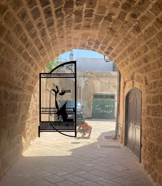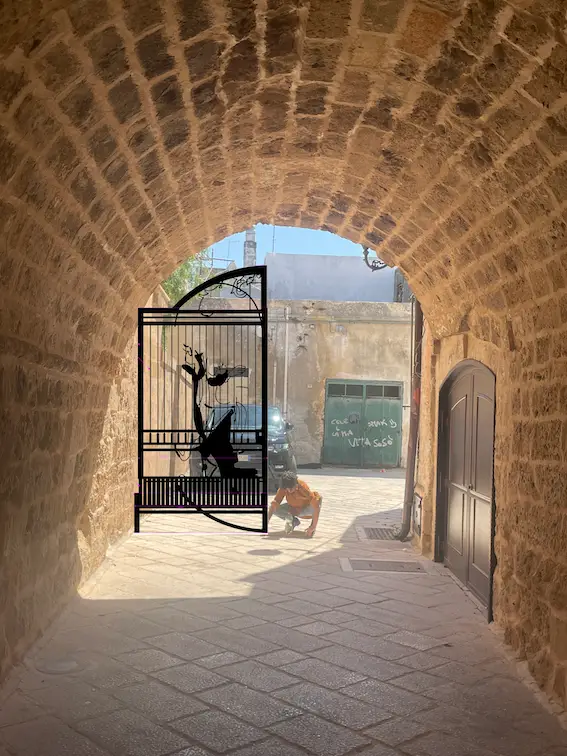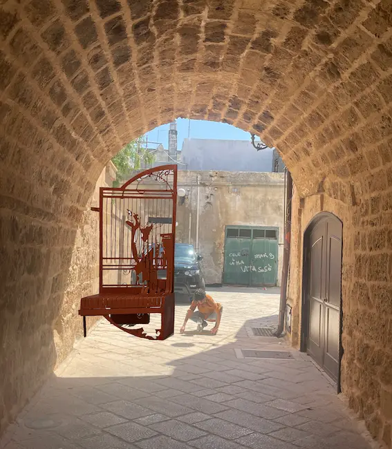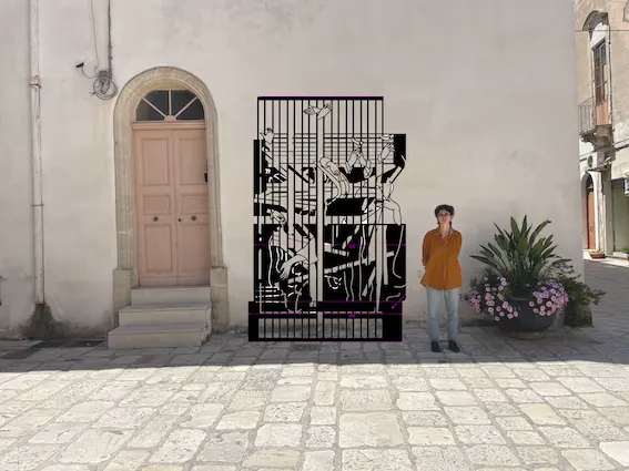 Barely invisible cities è un invito alla sosta, all’incontro e allo scambio radicato nel territorio, come suggerito dai motivi che adornano le sculture, ispirati agli affreschi del chiostro del Convento di Santa Maria delle Grazie, che ospita oggi il Comune di Maruggio. Il cancello diventa metafora per una riflessione sul paese, sul suo patrimonio artistico, sul suo presente storico, e sulle storie e narrazioni vive che ne animano il tessuto urbano. Scardinando cancelli e ringhiere per trasformarli in piattaforme fruibili e abitabili, l’artista invita a riflettere sull’importanza di incontrarsi e ritrovarsi, per trasformare insieme confini e prospettive di terre antiche ma tese verso il proprio futuro.