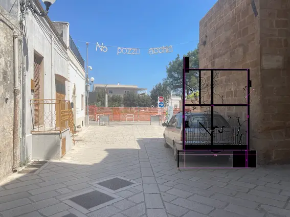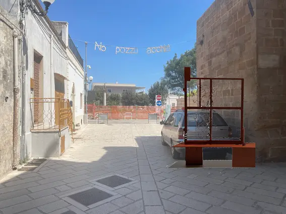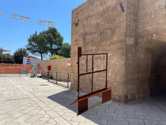 Evita Vasiljeva ha visitato Maruggio d’inverno, attraversando le strade semivuote di un borgo marittimo a riposo e potendo solo immaginare la carica vitale che gli riserva l’estate. Muovendosi tra le vie silenziose e ascoltando storie e leggende custodite dagli abitanti incontrati, l’artista si è soffermata sulla presenza ritmica di elementi discreti ma ricorrenti: recinzioni e cancelli. Proponendo un superamento della loro funzione preclusiva, Vasiljeva ha ideato dispositivi volti all’apertura e alla condivisione: tre portali in corten che appropriano l’estetica di inferriate arrugginite, unendola ad ampie sedute a più posti. All’apertura sull’inesplorato che un cancello può offrire, le tre sculture affiancano la possibilità inclusiva e generatrice del sedersi e immaginare insieme, proprio come Polo e Khan fanno nel racconto di Calvino.