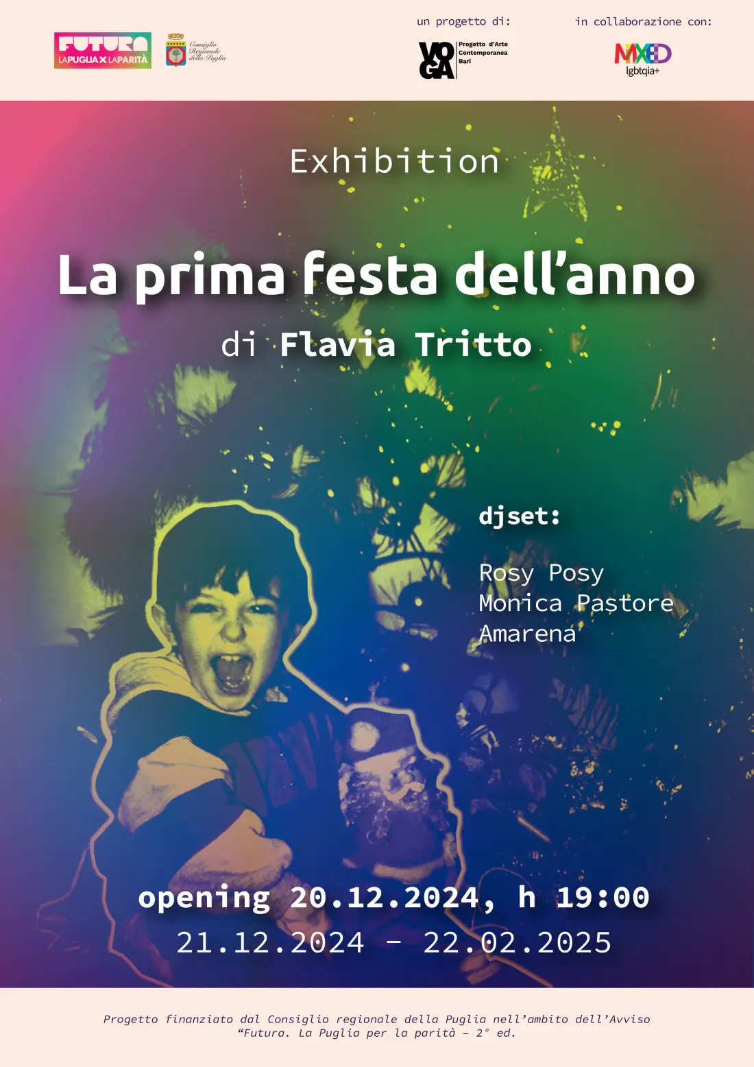 VOGA Art Project è felice di invitarvi venerdì 20 dicembre ore 19.00 all’inaugurazione di “La prima festa dell’anno”, mostra personale dell’artista barese Flavia Tritto. Unendo l’ impegno politico come attivista LGBTQIA+ alla pratica artistica, con la mostra “La prima festa dell’anno”, Flavia porta a termine il progetto “VIVA. Esperienza e visibilità lesbica dal presente al futuro in Puglia”, curato da VOGA Art Project in collaborazione con MIXED LGBTQIA+. “VIVA” ha coinvolto soggettività lesbiche e queer pugliesi in un percorso di ricerca culturale per l’emersione di vissuti e visioni di una fascia di popolazione invisibilizzata nell’immaginario collettivo.