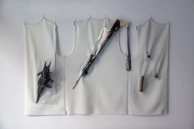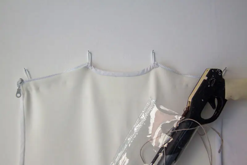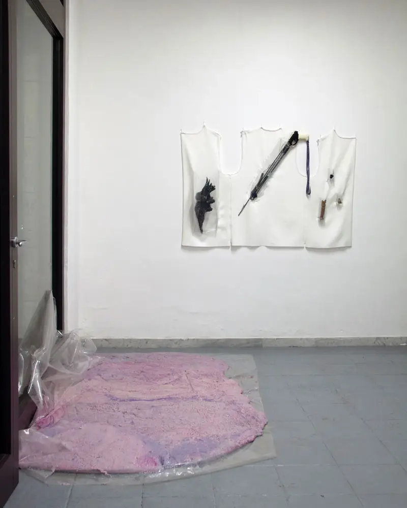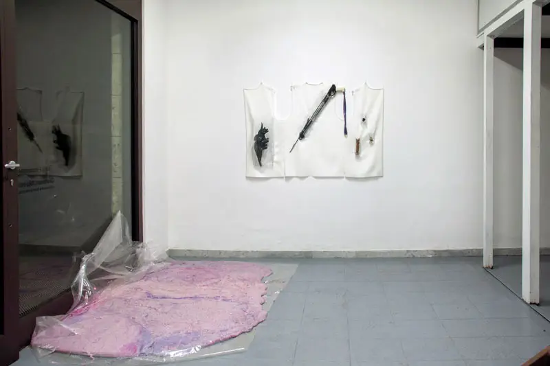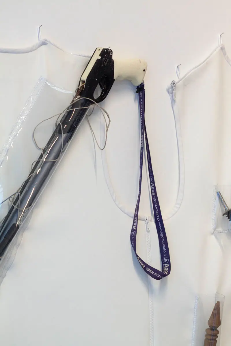 Questo aspetto celato della mostra ci porta direttamente a uno degli aspetti centrali della strategia dei gesture object, e cioè la rievocazione del lavoro riproduttivo femminile e il suo trasferimento nel contesto della produzione artistica. Per “lavoro riproduttivo” si intende l’insieme di tutte le attività di cura solitamente svolte dalla donna (come il l’avere e crescere figli, cucinare, pulire la casa, aiutare la nonna a fare il bagno), che la nostra società non riconosce come lavoro effettivo. L’artista riflette su questo “lavoro nascosto”, e usa i gesture objects per parlare di un’oppressione sistemica giocando sul filo sottile tra visibile e invisibile. In linea con questo ragionamento, Tanja Hamester ha scelto di celare dalla mostra anche il suo lavoro performativo dietro i gesture objects e il suo corpo che, rimossi dallo sguardo del pubblico, sono presenti sotto forma di impressioni e tracce: i calchi sui fogli di lattice, appesi nell’archivio mobile, e il wearable display, ovvero un gilet (realizzato in collaborazione con Elvira de Serio) indossato dall’artista durante le performance e installato a muro come espositore degli oggetti utilizzati. La mostra assume così l’aspetto di un archivio in divenire, inesauribile perché frutto di una ricerca che, cercando delle tracce, ne lascia sempre di nuove.