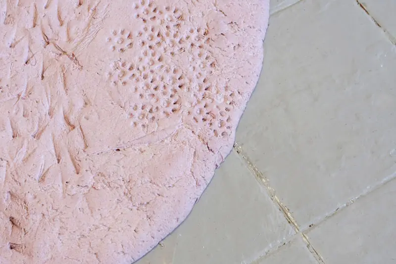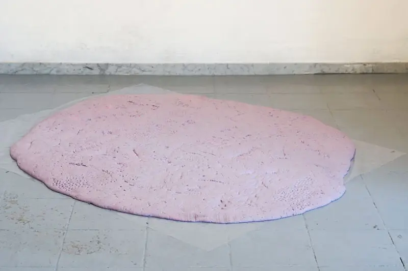 Questa postura è ancora più significativa se si tiene conto delle premesse con cui viene condotta la ricerca sul territorio: l’artista arriva in città come turista, e usa questa posizione come pretesto per costruire una narrazione personale ma allo stesso collettiva, che tenga conto di tutte le micronarrazioni di chi abita lo spazio. Non a caso, proprio nell’uso della pasta sale come materiale primario della mostra, l’artista svela la necessità dell’interazione con gli abitanti del luogo per poter parlare dello stesso. La superficie che accoglie le tracce dei gesture objects, infatti, è l’esito di due momenti laboratoriali che si sono svolti a gennaio nel cortile di VOGA. In questi workshop l’artista ha proposto ai partecipanti di lavorare insieme alla preparazione della massa, mettendo in scena un re-enactment di una pratica sociale ripresa dal passato.